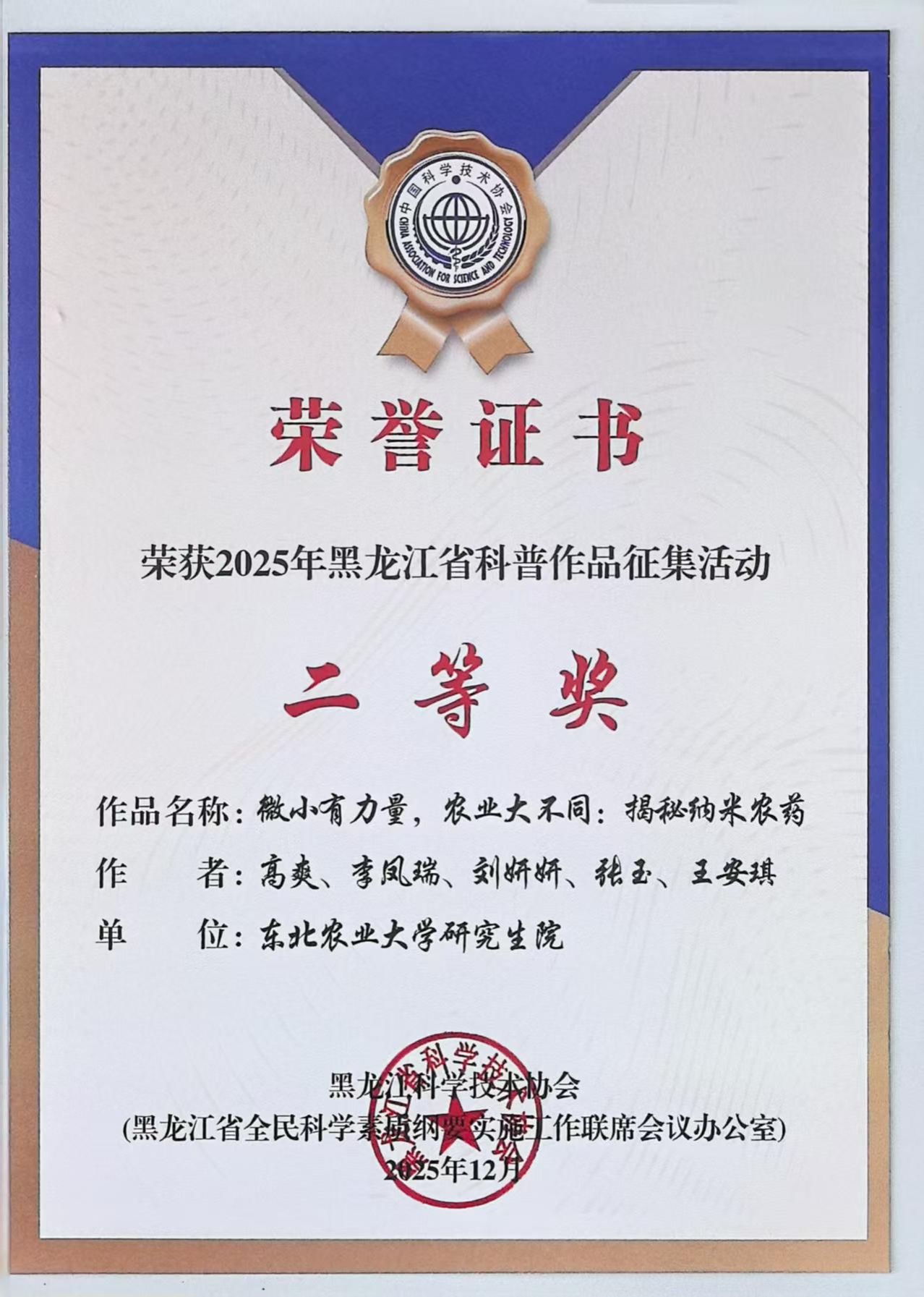 近日,文理学院高爽教授课题组创作的科普视频《微小有力量,农业大不同:揭秘纳米农药》荣获2025年黑龙江省科普作品征集活动二等奖。本次活动共征集各类科普作品共753件,经专家评审和省科协审定,评选产生获奖作品,其中一等奖22件、二等奖47件、三等奖80件。