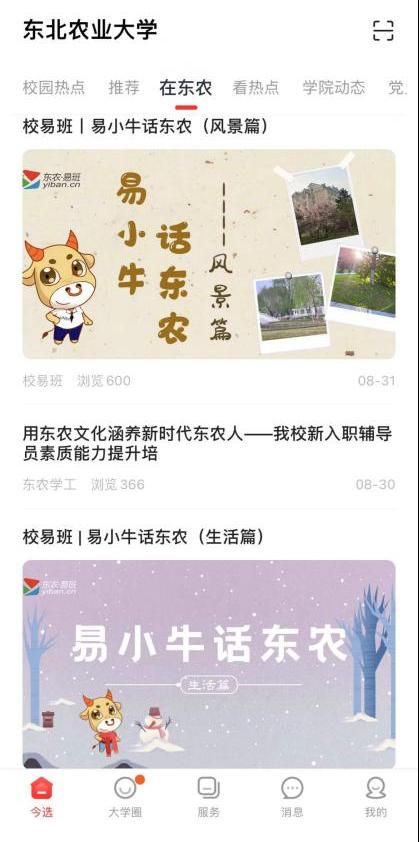 东北农业大学作为黑龙江省首批共建高校之一,自2018年7月正式启动易班建设工作以来,紧紧围绕立德树人根本任务,坚持以思想教育和价值引领为核心,充分挖掘易班网的功能和特点,注重文化建设,创新工作载体,原创设计了东农易班的专属卡通形象——“易小牛”,对易班的品牌文化建设和推广起到了非常重要的促进作用。