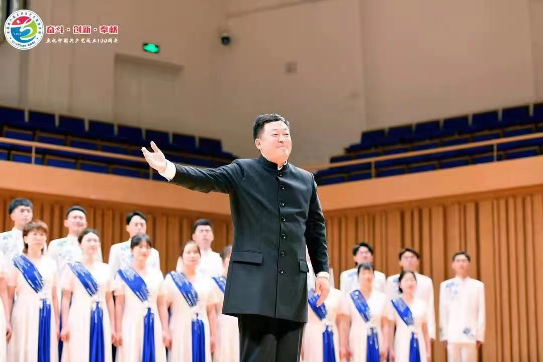 这个全部由非专业成员组成的大学生合唱团,每个周四、周日晚上的6点到9点,70余名来自东北农业大学各个学院的学生都会在这里集合,一起圆一个音乐的梦。指挥曹俊峰老师也是非专业指挥,本科音乐专业也“扔”了20年,在东北农业大学入职20年来一直在行政管理岗位工作,现任国资处物资采购科科长,学校每年的采购量特别大,工程招标、物资采购两个科室的工作他一人承担,忙碌的时候连喝水的时间都没有,走路都是小跑的,每天下班时间都在加班,周末还要把工作带回家处理,2020年整个寒暑假仅休息一天。但他一直没有放弃音乐的梦想,渴望做一些音乐专业的事儿。2016年,东北农业大学大学生合唱团的创始人、指导教师吕秀霞教授退休,把她精心培育的“孩子”交到曹俊峰老师的手中,他欣然地接受了这份工作,合唱团从无到有,再到全国艺术展演第一名的佳绩,曹俊峰老师在默默传承合唱团的精神,延续这份美妙的事业……“我至今仍然清晰的记得吕老师邀请我听了合唱团唱的一首《送别》,当歌声响起,我内心感动不已,被美妙的和声深深地打动。”曹老师说,也就是从那时起,雷打不动的每周两次排练,曹老师和合唱团便没有分开过,五年多来,风雨无阻地坚持排练。