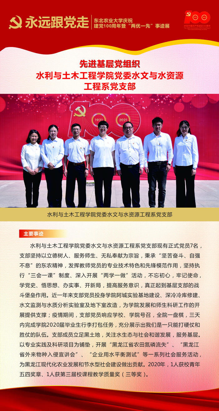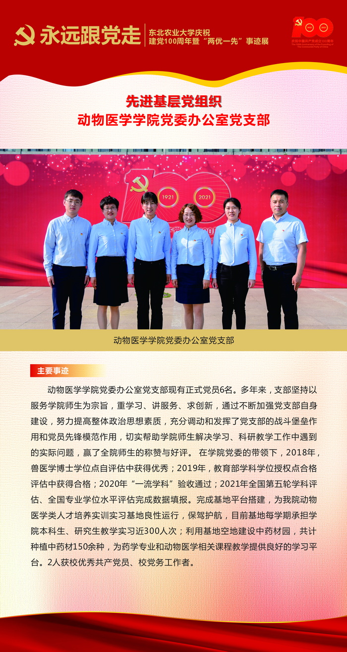 百年征程波澜壮阔,百年初心历久弥坚。永远跟党走,红色初心忠诚不变。永远跟党走,立德树人使命在肩。在庆祝建党100周年、十四五开局的历史新起点上,东北农业大学将坚持以习近平新时代中国特色社会主义思想和党的十九大精神为指引,把握大势,敢于担当,勇于作为,秉承“艰苦奋斗、自强不息”的东农精神,肩负起“为服务国家富强、民族复兴、人民幸福贡献力量”的时代重任,向着世界一流学科和高水平大学建设的目标奋勇前进!