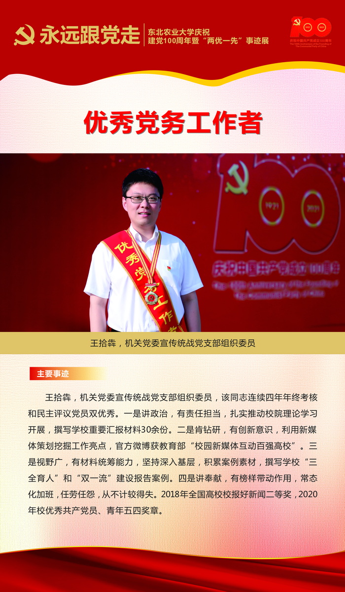 伟大时代呼唤伟大精神,崇高事业需要榜样引领。在庆祝中国共产党成立100周年之际,学校党委面向全校评选出一批先进基层党组织以及优秀共产党员和党务工作者。从三尺讲台到千里沃野,从党政管理到后勤服务,从默默钻研数十载的学者教授到争做时代先锋的优秀学子,从每个学生都关怀备至的辅导员到兢兢业业的保洁人员,一名党员就是一面旗帜,一个组织就是一座堡垒。这些共产党员先优代表在平凡的岗位上用执着坚守书写了东农人教育报国的不变初心,以无私奉献诠释了东农老师立德树人的光荣使命,为新时代祖国农业现代化事业的发展注入了源于东农的勃勃生机!为更好地宣传好先优事迹,凝聚东农奋斗力量,宣传部特开设栏目《东北农业大学庆祝建党100周年暨“两优一先”事迹展》,进行专题报道。