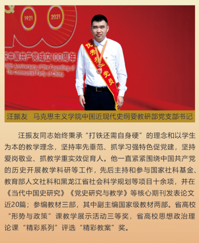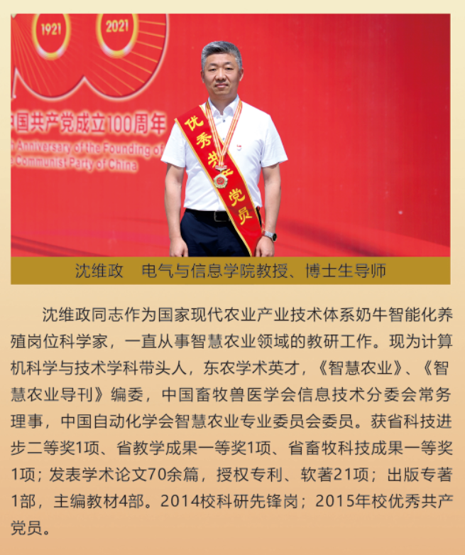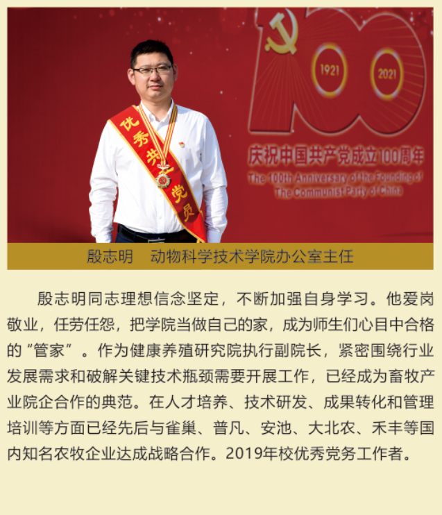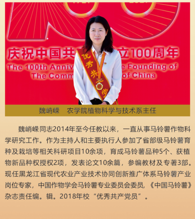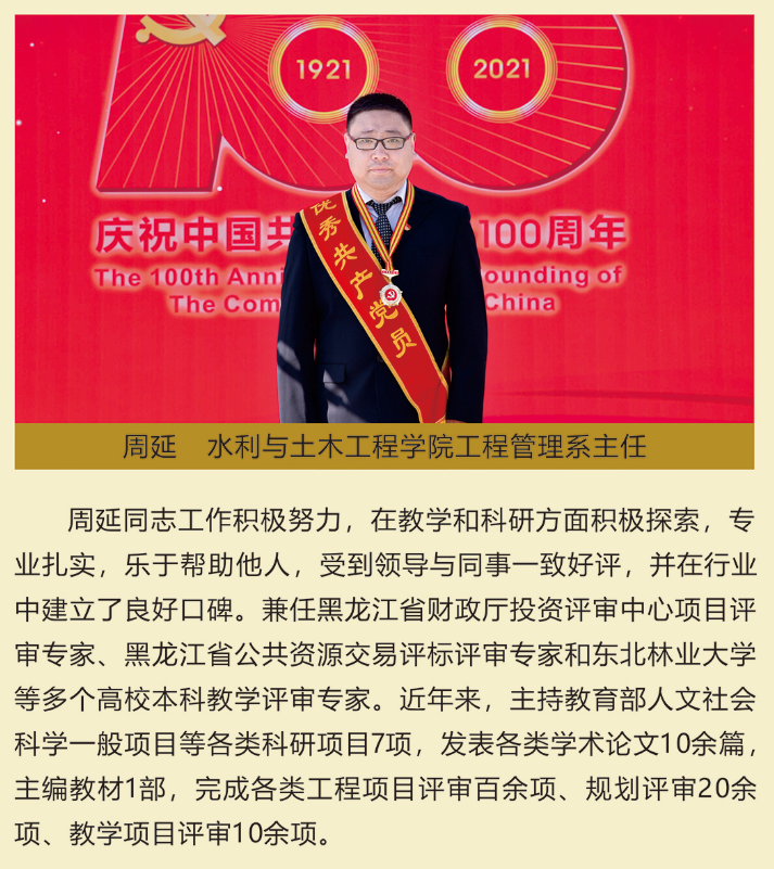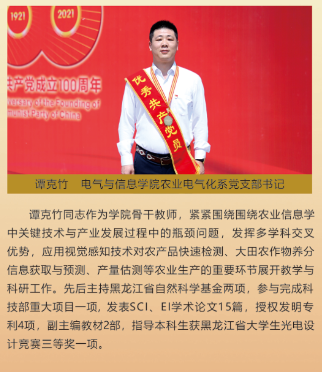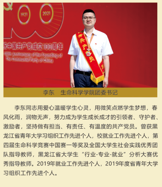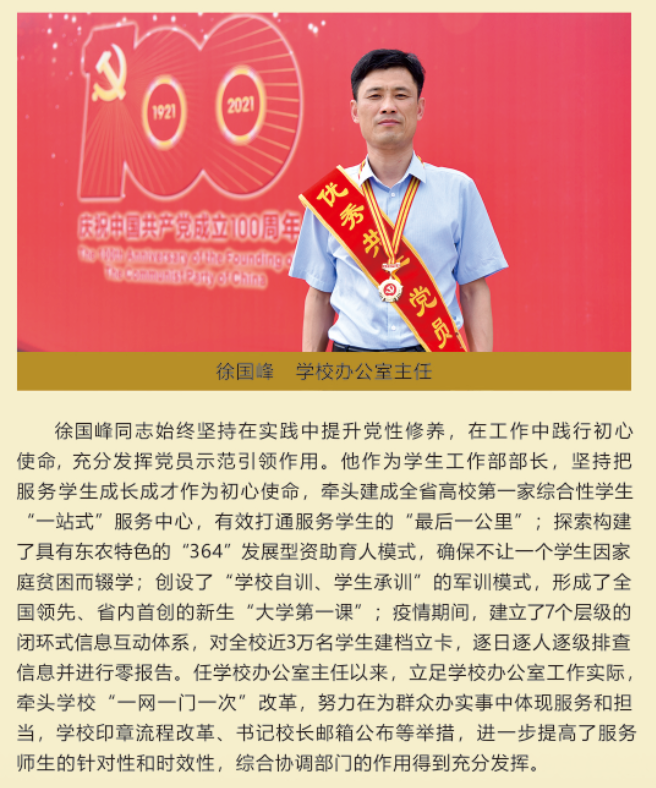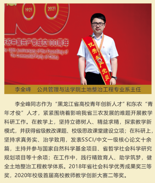 伟大时代呼唤伟大精神,崇高事业需要榜样引领。在庆祝中国共产党成立100周年之际,学校党委面向全校评选出一批先进基层党组织以及优秀共产党员和党务工作者。从三尺讲台到千里沃野,从党政管理到后勤服务,从默默钻研数十载的学者教授到争做时代先锋的优秀学子,从每个学生都关怀备至的辅导员到兢兢业业的保洁人员,一名党员就是一面旗帜,一个组织就是一座堡垒。这些共产党员先优代表在平凡的岗位上用执着坚守书写了东农人教育报国的不变初心,以无私奉献诠释了东农老师立德树人的光荣使命,为新时代祖国农业现代化事业的发展注入了源于东农的勃勃生机!为更好地宣传好先优事迹,凝聚东农奋斗力量,宣传部特开设栏目《东北农业大学庆祝建党100周年暨“两优一先”事迹展》,进行专题报道。