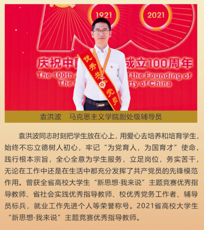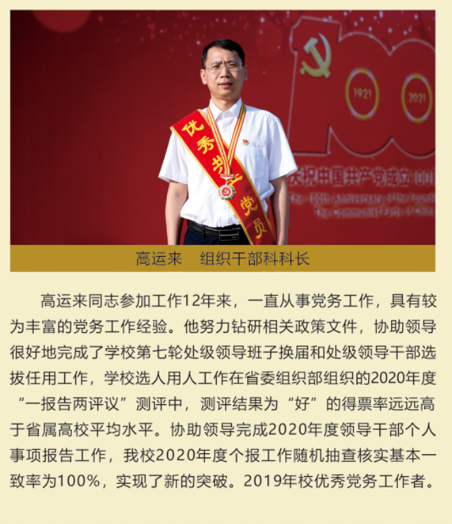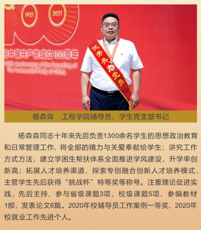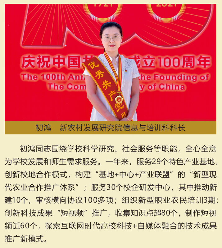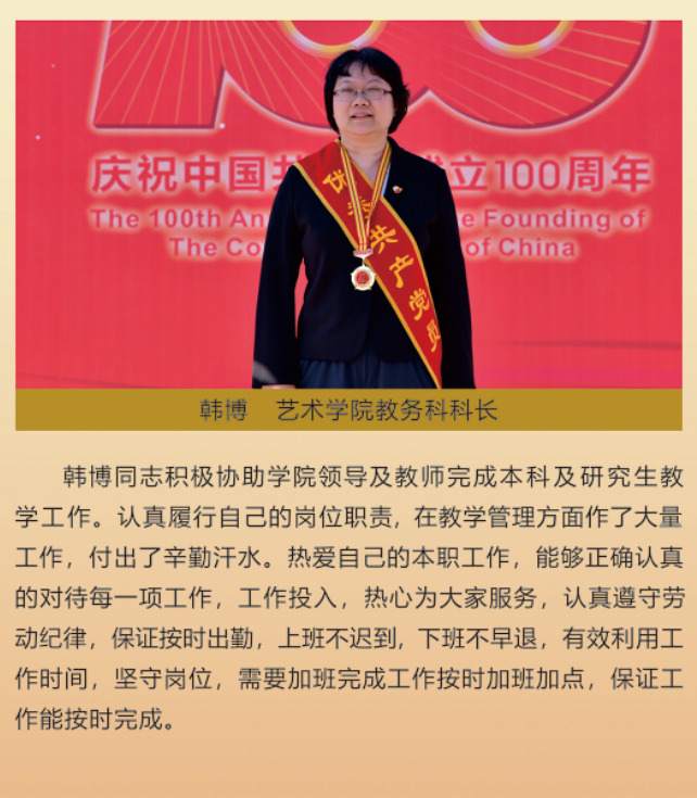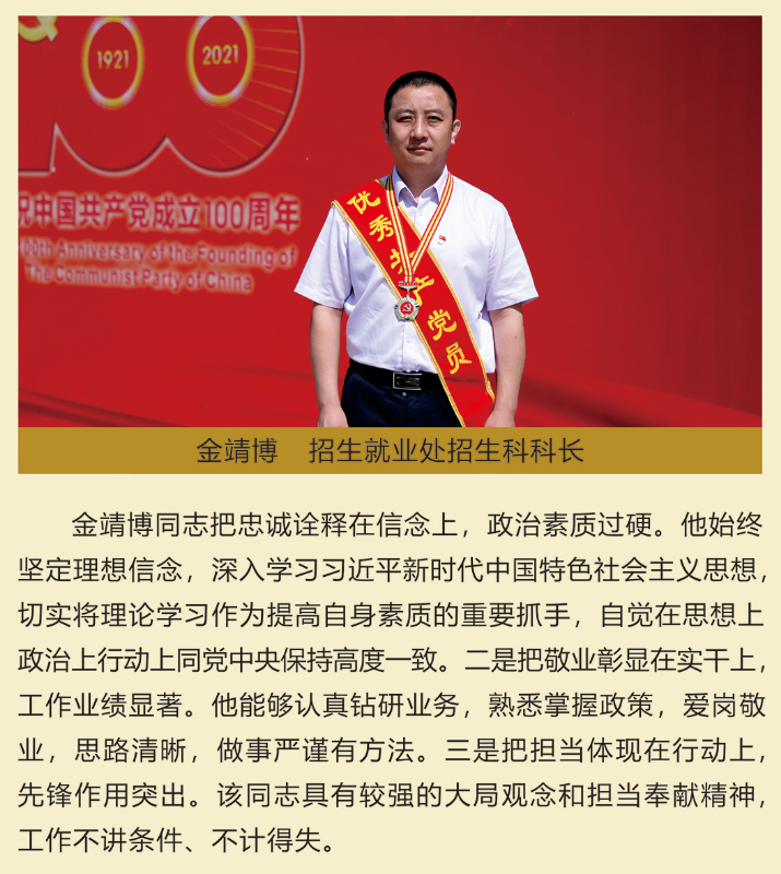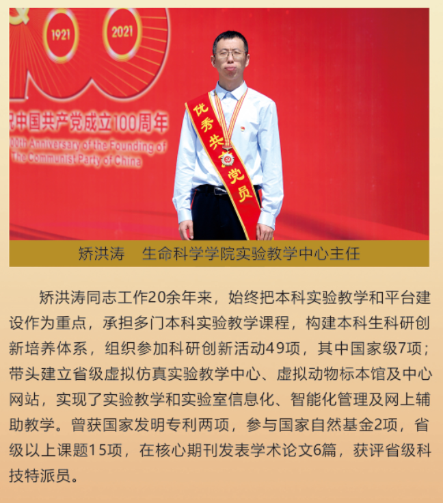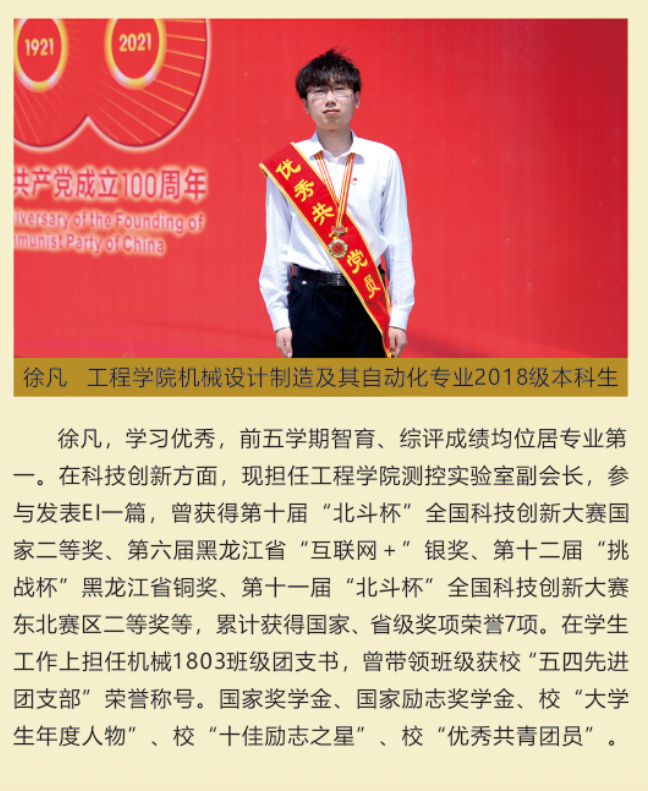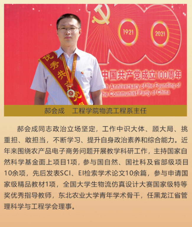 伟大时代呼唤伟大精神,崇高事业需要榜样引领。在庆祝中国共产党成立100周年之际,学校党委面向全校评选出一批先进基层党组织以及优秀共产党员和党务工作者。从三尺讲台到千里沃野,从党政管理到后勤服务,从默默钻研数十载的学者教授到争做时代先锋的优秀学子,从每个学生都关怀备至的辅导员到兢兢业业的保洁人员,一名党员就是一面旗帜,一个组织就是一座堡垒。这些共产党员先优代表在平凡的岗位上用执着坚守书写了东农人教育报国的不变初心,以无私奉献诠释了东农老师立德树人的光荣使命,为新时代祖国农业现代化事业的发展注入了源于东农的勃勃生机!为更好地宣传好先优事迹,凝聚东农奋斗力量,宣传部特开设栏目《东北农业大学庆祝建党100周年暨“两优一先”事迹展》,进行专题报道。