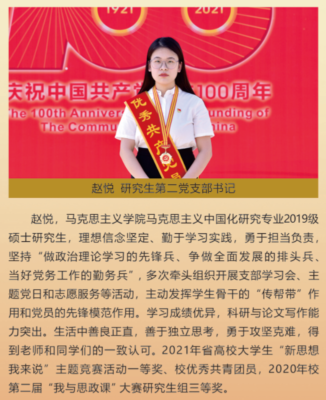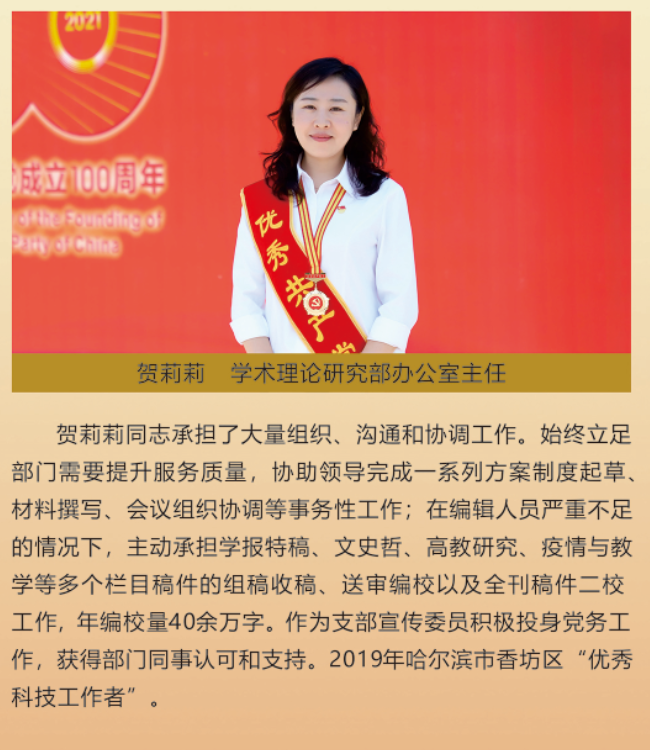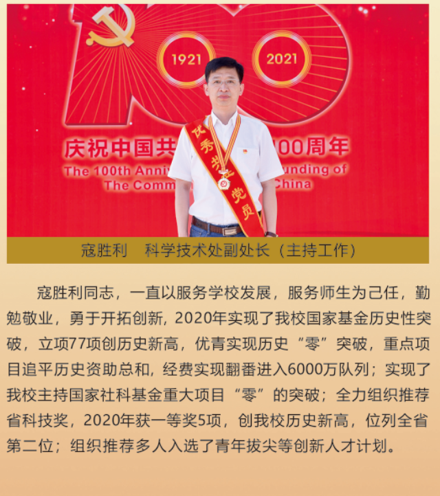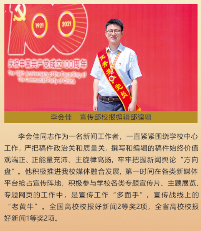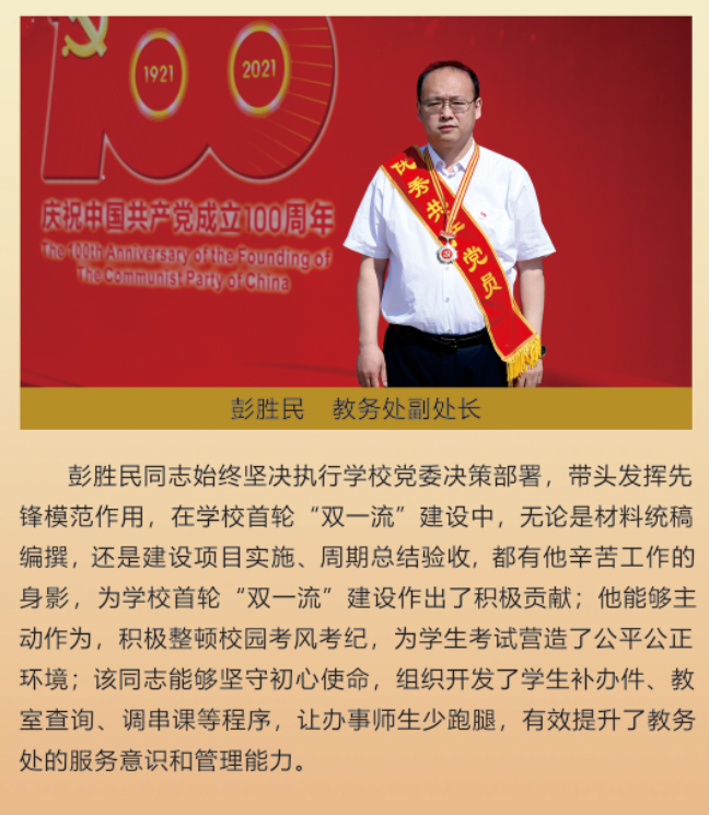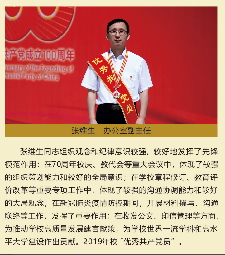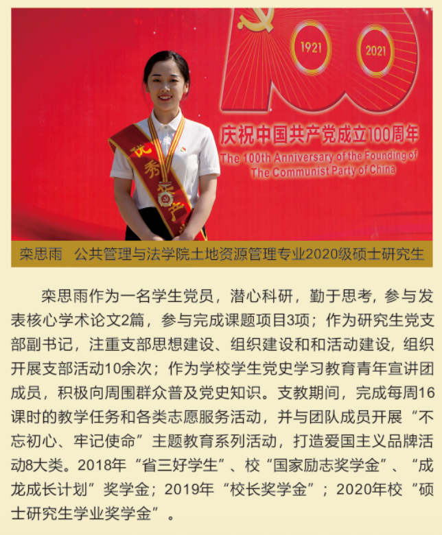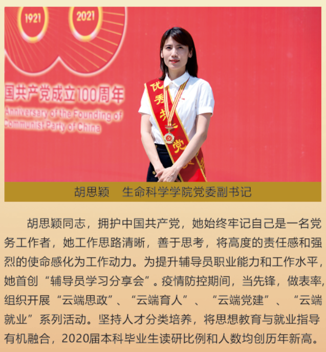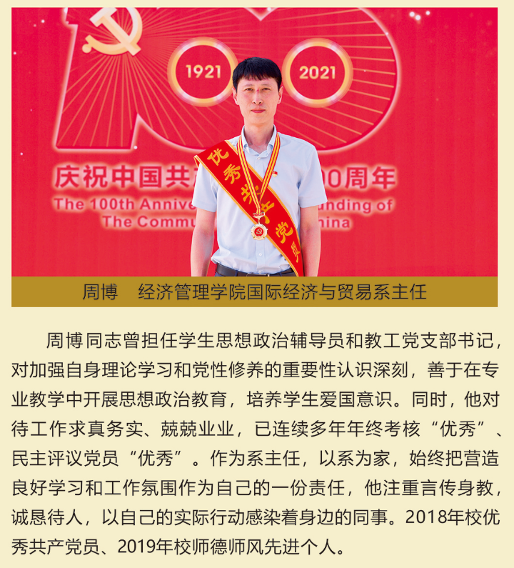 伟大时代呼唤伟大精神,崇高事业需要榜样引领。在庆祝中国共产党成立100周年之际,学校党委面向全校评选出一批先进基层党组织以及优秀共产党员和党务工作者。从三尺讲台到千里沃野,从党政管理到后勤服务,从默默钻研数十载的学者教授到争做时代先锋的优秀学子,从每个学生都关怀备至的辅导员到兢兢业业的保洁人员,一名党员就是一面旗帜,一个组织就是一座堡垒。这些共产党员先优代表在平凡的岗位上用执着坚守书写了东农人教育报国的不变初心,以无私奉献诠释了东农老师立德树人的光荣使命,为新时代祖国农业现代化事业的发展注入了源于东农的勃勃生机!为更好地宣传好先优事迹,凝聚东农奋斗力量,宣传部特开设栏目《东北农业大学庆祝建党100周年暨“两优一先”事迹展》,进行专题报道。