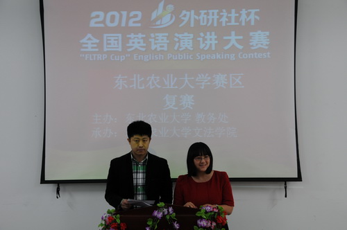 10月24日下午,由东北农业大学教务处主办、文法学院承办的“2012东北农业大学英语演讲大赛决赛暨2012‘外研社’杯英语演讲比赛东北农业大学复赛”在成栋楼1106报告厅举行。教务处处长王杜春、文法学院党委书记曲长祥、院长韩学平、副书记宫建伟、副院长胡家英、王平达等出席了本次大赛。大学英语教研部杨亚丽主任和外籍教师Rash等担任评委。大赛由英语教师张力、满盈主持。