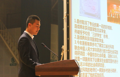 电气与信息学院宫采炎,经济管理学院张美晨,文法学院徐凤玉,食品学院王琦,理学院张向挺五名同学先后结合自己的成长奋斗经历,和现场师生共同分享了他们精彩的大学故事和成长路上的心得体会。他们中有的坚持不懈,在求学路上扎实前行、勇攀高峰;有的自立自强,志愿服务,用爱心回报社会;有的热衷科技创新,坚持团队合作,在科技比赛中屡创佳绩;有的勇于担当,敢于挑战,在各项创业大赛中勇拔头筹。