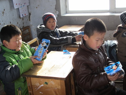 看见我们带来的崭新的电脑,孩子们一下子兴奋起来。一个男孩问,叔叔、阿姨,这是给我们的吗?魏晓莉笑着说,对呀,我们是东北农业大学的,今天就是来给你们送计算机的!没想到小男孩一下子站起来,立正,认认真真对我们弯腰敬了个礼,说:“谢谢叔叔阿姨!”其他孩子也嚷起来,真的呀,太好了!有微机了,我们能上微机课了,太幸福啦!