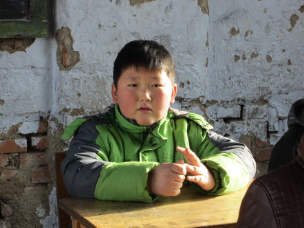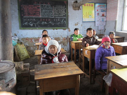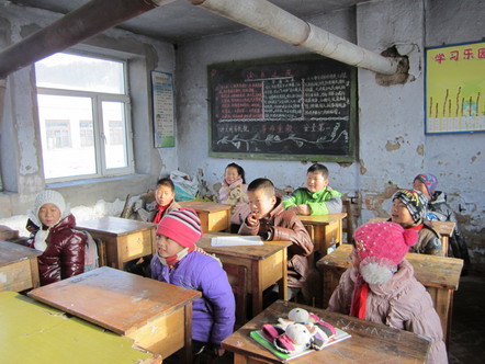 环顾四周,十平米左右的教室里墙壁土坯剥落,墙角堆着生火的木块,书桌年久破旧,教室里用来取暖的是一个土制火炉,上边连着铁皮烟囱。虽然生着炉子,但孩子们在教室里上课还是得穿着棉衣。就是在这样简陋的教室里,24个孩子在7位老师的教导下,认真、刻苦的学习着。