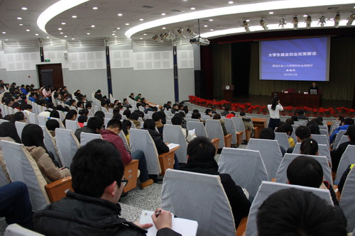 “2005年以来,全省创业培训51.37万人,成功创业34.35万人,创业培训成功率达到67%,实现创业带动就业66.82万人。”报告会上,徐晓伟通过数据为同学分析了现阶段国内外就业形势,重点解读了国家及黑龙江省对大学生就业、创业实行的各项政策。他说,“大学生要抓住时机,好好研究这些政策,利用国家或省里的政策进行创业。”在谈到如何创业时,他说“除了研读好政策,合理的定位自己的创业方向也必不可少。市场有什么需求,自己适合做哪种行业,所从事的行业的内容及环境如何,哪些政策可以合理利用,这些都是创业者必须考虑的问题。”报告中,徐晓伟提到,发达国家高校毕业生创业成功率为20%,我国为1.6%,毕业三年后我国创业率平均达到4.4%,我省不足1%。其中的原因除了创业政策扶持力度尚显不足,政府和其他外部资源的支持力度有限外,大学生创业能力不足是最重要的因素之一。徐晓伟强调,对于提高学生就业质量、培养有竞争力的就业者、提高学生的创业能力,社会及高等教育肩负着重要的责任和使命。