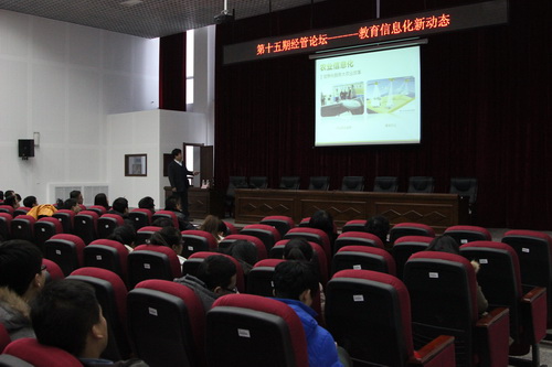 12月25日下午,经济管理学院邀请张长利副校长做客第十五期经管论坛。经管学院党委书记蔡云国,院长李翠霞,副院长张启文、张永强、庞金波出席活动,近百名师生聆听了张长利带来的《教育信息化新动态》专题报告。
