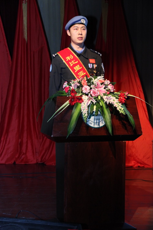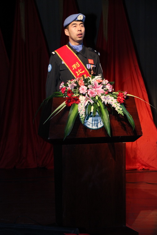 第一个作报告的是维和警察防暴队长国向东,他中等个头、偏瘦、戴着眼镜,比起魁梧的战友,国向东更像一个文质彬彬的书生,他言谈举止间透出稳重与成熟。国向东为师生讲述了部队在利比里亚的维和经历。