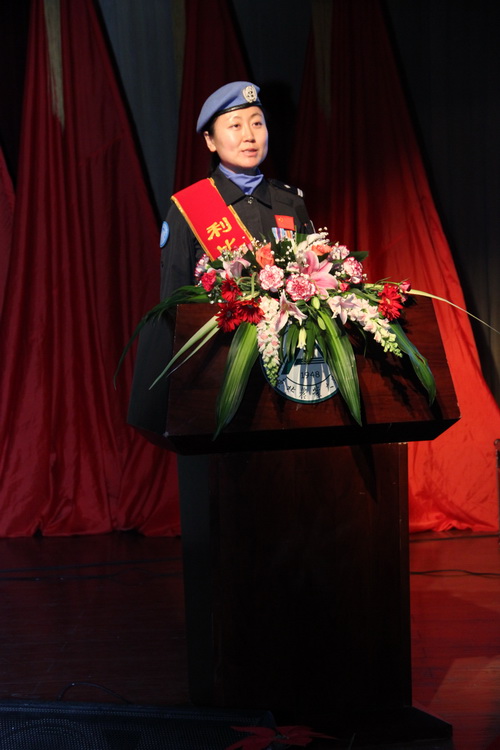 史双单是维和队员家属代表,她说:“我至今还记得爱人听说有维和任务时他那兴奋地表情,他在义无返顾的报名后才小心翼翼的征求我的意见,而我的内心却充满了矛盾,我渴望小家的温馨,渴望他与我一起见证孩子的成长,但我也深知维和梦是每一个军人的梦想。和平时期维和报国是何等的光荣,同时也意味着危险,我一方面希望他能为国尽忠,一方面又希望他能留在我的身边,带着这样的纠结我们迎来了2013年10月22日,就在这一天我们的爱人将代表祖国远征西非去履行和平使命。”史双单讲述了九十岁高龄的老奶奶为执行维和任务的孙子送行,维和人员妻子马姗姗独自照顾癌症晚期的公公的故事。