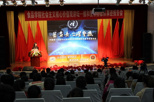12月12日下午,中国第一支赴利比里亚维和英雄先进事迹报告团做客我校食品学院社会主义核心价值观讲坛。活动前,我校党委副书记胡国良亲切接见了报告团一行。黑龙江省边防总队政治部副主任潘庆焘,黑龙江省边防总队政治部宣传文化处处长张仲凯,校党委副书记胡国良、党委宣传部部长宋跃芬,学生工作处处长徐国峰,食品学院党委书记张铁、校团委相关负责人,各学院主管学生工作的副书记、各学院学生代表参加了报告会,会议由宋跃芬主持。