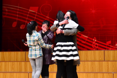 “好,那么今天我们也为二位准备了一个特别的惊喜”随着主持人的话语,张译丹、高琢淇转身惊喜的发现自己的母亲正站在身后,听她们说出自己的心里话。母亲与孩子相拥而泣,台下爆发出热烈的掌声。