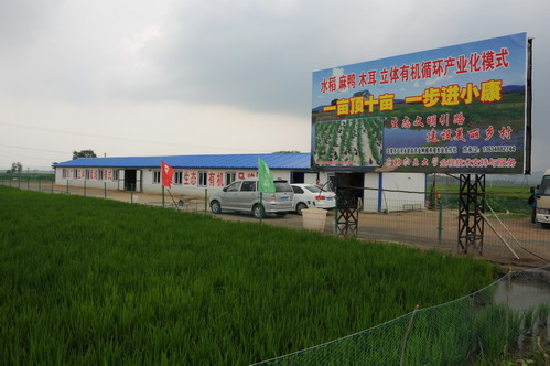进了庆丰村,远远就看见一块醒目的牌子写着“水稻麻鸭木耳有机循环产业化模式 ”,“一亩顶十亩,一步进小康”。