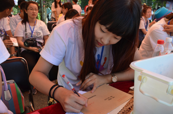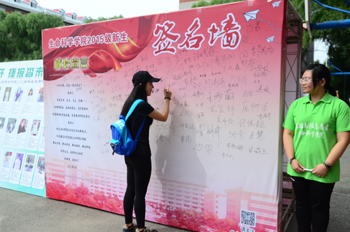 生命与科学学院迎新的主题是“你好,生命!”,表达了生命科学学院的全体老师、同学用饱满的精神和周到的服务欢迎新生命融入生命与科学学院大家庭。在迎新现场一面色彩斑斓的签名墙上,新生纷纷在上面留下自己的姓名,志愿者为新生和家长提供拍照服务,还将照片打印出来贴在签名墙上。
