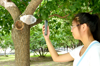 在南区篮球场签到完毕后,新生高玉婷在志愿者的引导下赶往宿舍,她的身边没有陪同的家长。她说:“我家是哈尔滨的,离着近,不用家长送,自己可以来报到。”路上,发现很多书上都挂着卡片,“名片”上清楚的注明了这是一棵山杏树,还有英文学名、科属和别名,右侧有树木资料的二维码,她拿起手机微信扫描了一棵树木“名片”上的二维码,饶有兴趣的阅读着山杏树的信息:产地分布、形态特征、主要用途等。