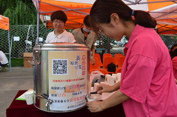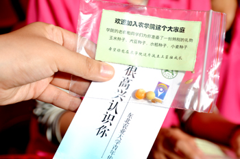 农学院给每个新生赠送的第一个礼物是一个装有四颗种子的新生礼包,这四颗种子分别象征着农学院的主要研究方向:大豆、玉米、水稻、小麦,独具特色。迎新报到处,学生和家长们还能品尝到美味的豆浆。据现场一位工作人员介绍,磨豆浆的大豆来自学院大豆专家陈庆山老师的实验室,是陈庆山科研团队的科研成果。学院还为新生准备了便利贴让新生写下自己的心愿,贴在心愿墙上,启发新同学对大学四年生活进行认真思考。