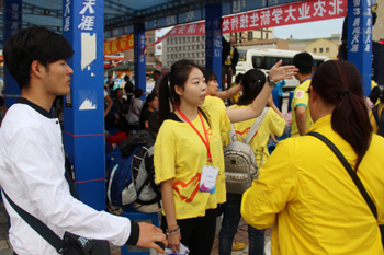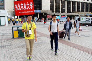 王丽研是26日我校哈站迎新志站点迎接到的第一位2015级新生。5点多一下车,以为自己来得太早了,早就做好了打车去学校的打算,看到东北农业大学新生接站处,她吃了一惊。王丽研妈妈感动地表示,“咱们学校太辛苦了,我们是哈站今天早上第一个到的,根本没想到能有人接。”