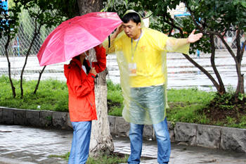 27日,台风登陆风力大幅减弱,但哈尔滨市风雨交加。校园里,志愿者和保卫处的工作人员身着雨披在风雨中坚守岗位,在恶劣天气条件下,为报到新生和家长提供了热情和周到的服务,让很多新生倍受感动。