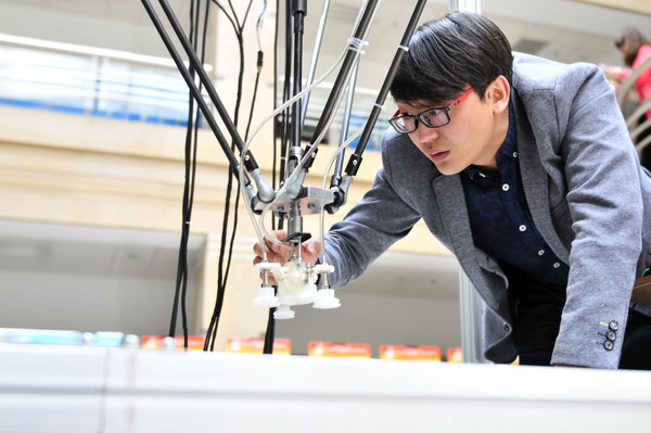 由于带领学生做的科创项目中,不但包含机械制造方面的知识,还涉及编程、自动化、传感技术等等其他专业知识,权龙哲总是要不断的学习、给自己充电。在去往挑战杯赛场的路上,权龙哲闲暇之余拿出一份大连理工大学的关于“并联机构”的硕士论文,“是在网上下载的,论文的理论可以指导我们现在进行的项目‘北方典型农产品的轻简式分拣分装系统’,我们在理论上做的还不到位,工科院校细致严谨的素质是值得农科院校学习的。”