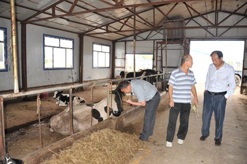 当我们一行来到林甸县润琦现代化牧场,还未走进牧场,就从远处看到鳞次栉比的现代化牛舍,在8月纯净的蓝天白云下显得格外壮观。走进牧场,各区划分合理,栋栋牛舍井然有序,运料、喂水、清粪等各个环节处处彰显着现代化牧场的气息。经了解,这个牧场是在岳奎忠的直接指导下建设的一个现代化生态示范牧场。从牧场的规划设计、牛舍的布局、功能区的设置分类、养殖规模、养殖工艺和疾病防疫等都由岳奎忠亲自指导。润琦集团总经理李同柱介绍,他们之所以决定投资建设这个牧场,就是看中了林甸县的奶牛养殖发展环境,并且知道这里有个东农来的岳县长能帮助他们解决养殖中的所有技术问题,让他们这些养牛的“门外汉”有信心去做这个产业。他风趣的说:老话讲“家财万贯,带毛的不算”,我们这一投资就是两个多亿,最重要的就是看好岳教授和东农的金字招牌,让我们心里有底。