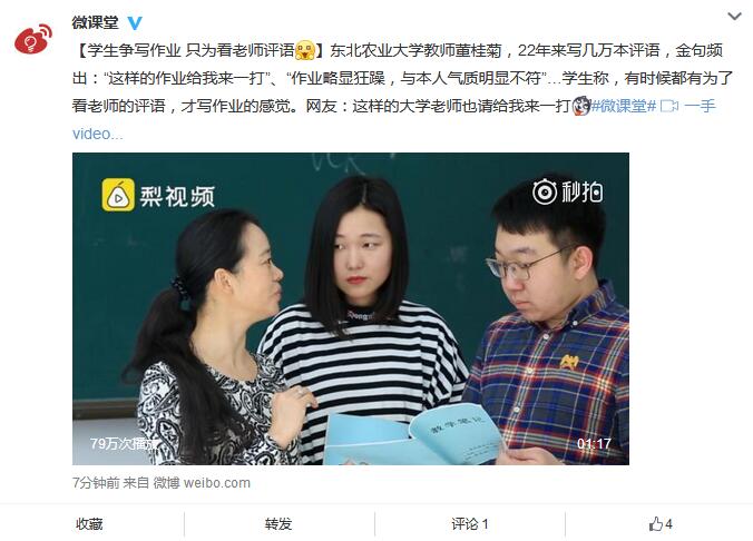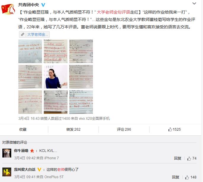董桂菊认为课后作业是反映学生对知识点掌握程度的一个重要窗口,尽管面向学生人数多,但她22年坚持认真批改每一本作业,给出不同的评语,指出亮点和问题。就是这些充满温暖、幽默和正能量的评语一步步拉近了和学生的距离。