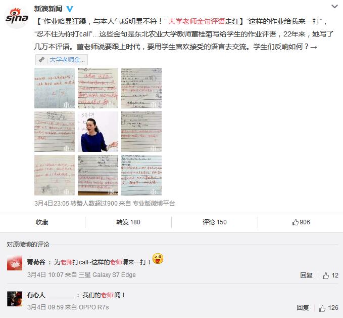 董桂菊总是变着花样想“文案”鼓励学生,对于认真完成作业的学生,她会写下这样的评语:“你的作业就是我的标准答案!今天的阳光,很美好!今天的咖啡,很美好!有时间发呆,很美好!你的作业,很美好!谢谢你成就了那么多的美好!”,“只要坚持努力,总有一天,你会活成你最想要的样子”,“忍不住为你打call”,“这样的作业给我来一打”……当然,也有马虎懒惰的学生,董桂菊会写下这样评语:“幸运是不存在的,努力才是硬道理”,“作业略显狂躁,与本人气质明显不符!”,“颜值明显提升,但有的题结题过程过于简单,忽略太多,这样不好”……