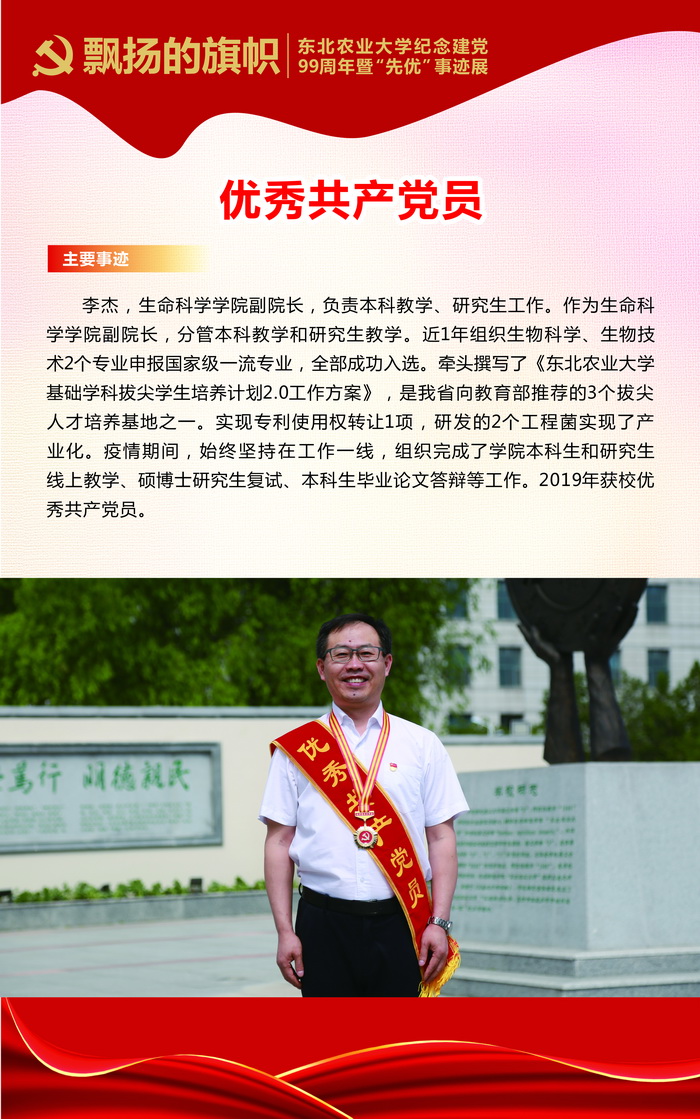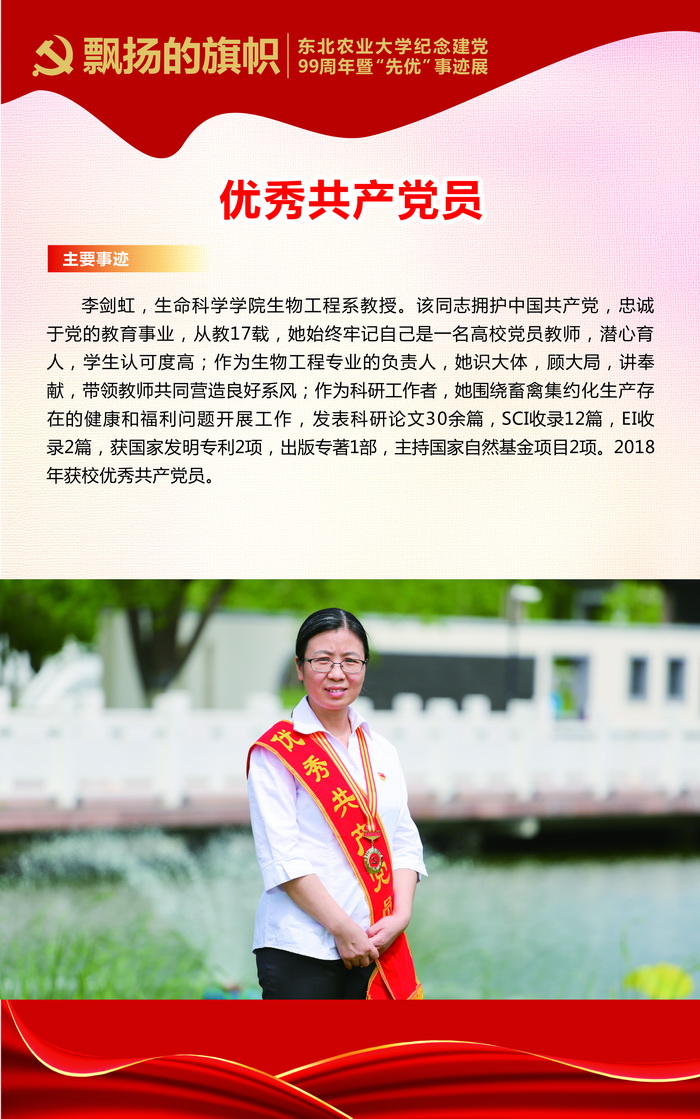 高举旗帜跟党走,创先争优树典型。在建党99周年之际,我校在“七一”当天举行了“飘扬的旗帜——东北农业大学纪念建党99周年暨‘先优’表彰活动”,表彰过去一年里在学校建设发展、疫情防控中涌现出来的先进集体和优秀个人。此次表彰学校共评选出先进基层党组织18个,优秀共产党员68人,优秀党务工作者21人,疫情防控党员先锋8人。这些先进集体和优秀个人信念坚定、业绩突出、群众公认,综合素质全面过硬,是我校各条战线上的优秀代表,体现了新时代共产党员的精神风貌,诠释了新时代东农人的优秀品质。