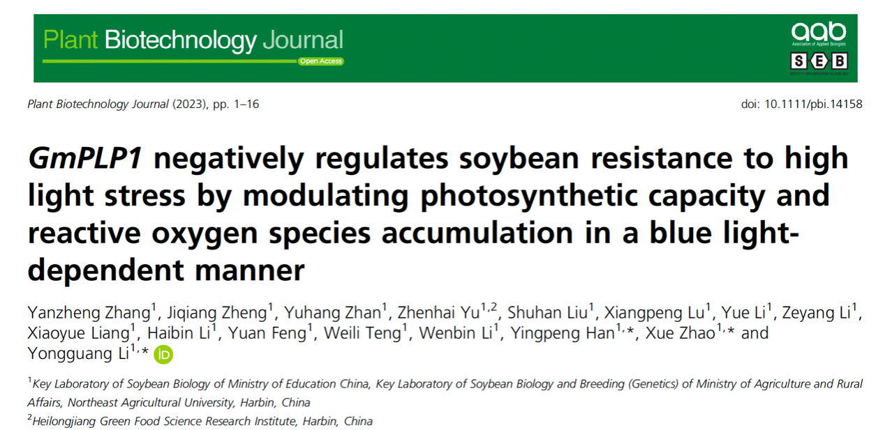 8月18日,植物学国际顶尖权威学术刊物《Plant Biotechnology Journal》(一区TOP,影响因子13.8)在线发表了农学院韩英鹏、李永光、赵雪研究团队的最新研究成果“GmPLP1negatively regulates soybean resistance to high light stress by modulating photosynthetic capacity and reactive oxygen species accumulation in a blue light-dependent manner”研究论文,揭示了在大豆中GmPLP1以蓝光依赖的方式负调控大豆对高光胁迫的耐受性。这一发现为了解植物对不断变化的光环境适应性提供了新的见解,是我校主持承担国家重点研发计划“揭榜挂帅”课题的标志性成果。