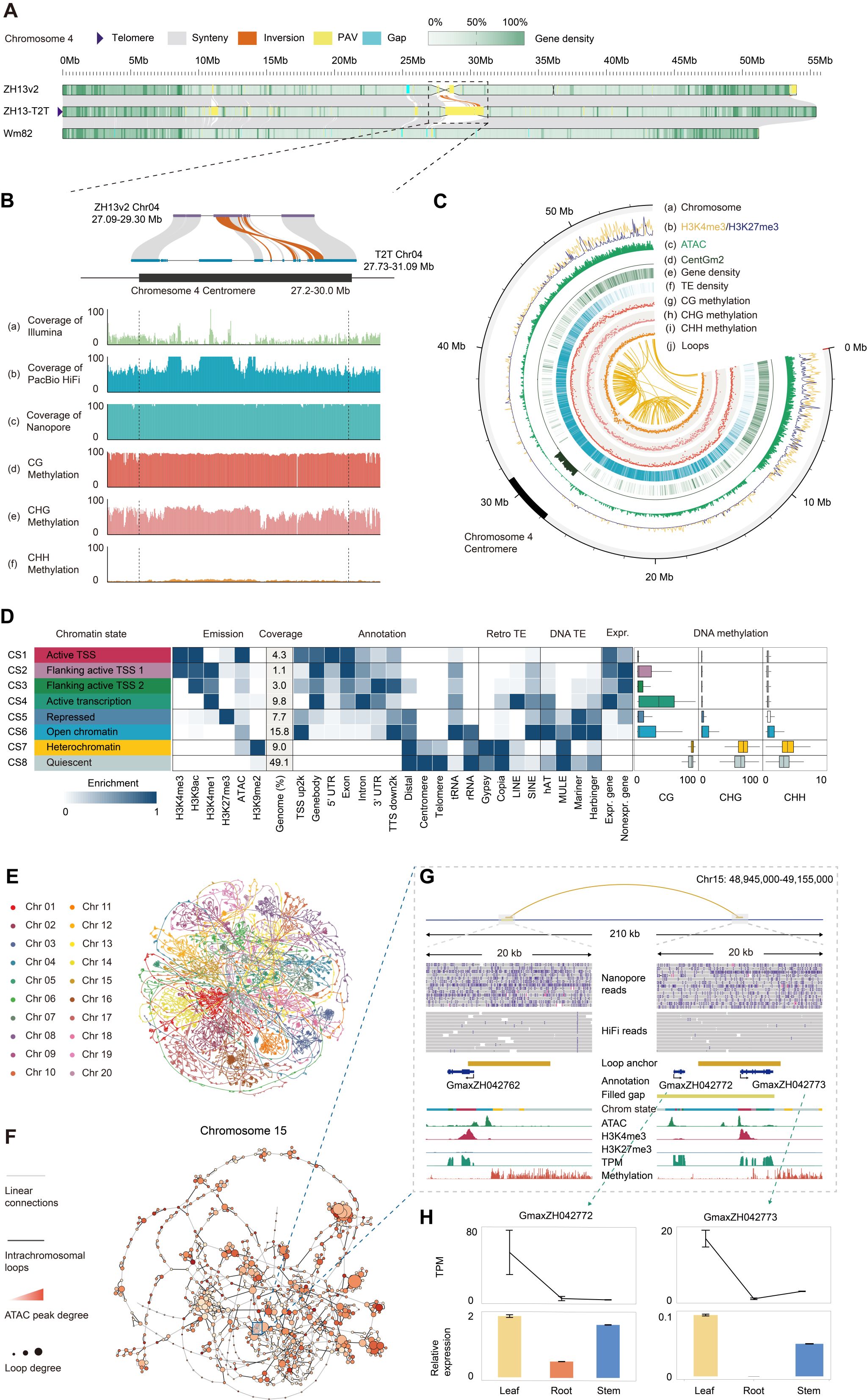 在本研究中,研究人员首先整合了Nanopore超长测序、PacBio HiFi测序和Hi-C技术,成功组装了近乎完整的ZH13-T2T基因组,填补了ZH13v2基因组的空白区域,特别是着丝粒和端粒区域。作者补充了约26Mb的新序列,并校正了35个倒位和163个易位,其中大部分结构变异发生在着丝粒区域,为进一步研究大豆的功能基因组提供了坚实的数据基础。为了探讨大豆ZH13-T2T基因组的表观修饰模式,研究人员整合了多种组蛋白修饰测序数据,包括H3K4me3、H3K27me3、H3K9ac、H3K4me1和H3K9me2,以及染色质开放水平测序数据(ATAC-seq),将基因组分为8种不同的染色质状态。这一工作揭示了具有不同生化特性的各种基因组区域的分布,并突显了不同染色质状态下DNA甲基化、转座子(TE)富集和基因表达之间的复杂关系。作者还使用Nanopore数据检测了ZH13着丝粒和端粒区域的DNA甲基化水平,并表明了第三代测序在准确捕捉复杂区域甲基化信号方面的潜力。此外,研究人员还通过分析Hi-C数据构建了ZH13的三维互作网络,鉴定了潜在的近端和远端的调控元件,为深入研究大豆的功能元件提供了新资源。该研究不仅成功组装了中国大豆品种ZH13的T2T基因组,还绘制了首个完整的表观遗传修饰图谱,解析了大豆复杂区域(着丝粒与端粒)的表观修饰特征,将极大地促进了对大豆基因表达调控网络的研究以及育种工作的进行。
