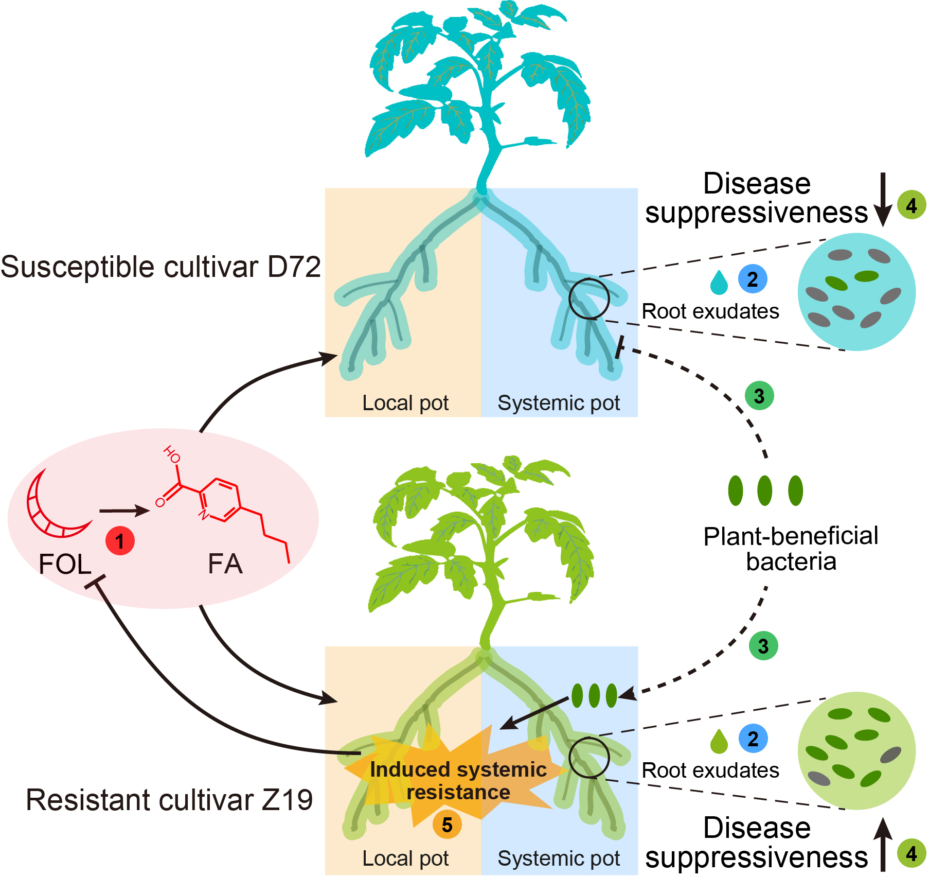 近日,东北农业大学园艺园林学院研究员周新刚等与多家单位合作,在解析土传病原真菌与植物互作机理方面取得新进展,成果以《Fusaric acid mediates the assembly of disease-suppressive rhizosphere microbiota via induced shifts in plant root exudates》为题发表于在国际著名期刊《自然•通讯》 (Nature Communications)。该研究揭示了番茄枯萎病菌产生的镰刀菌酸通过诱导番茄根系分泌物变化从而调控根际微生物组抑病力。