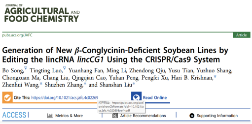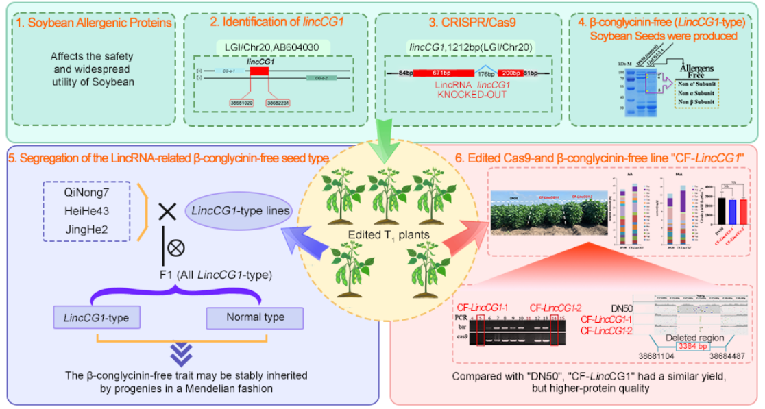 东北农业大学刘珊珊/张淑珍团队应用CRISPR/Cas9技术编辑大豆长链非编码RNA,lincCG1创制LincG1-型(β–conglycinin-deficient type)低致敏大豆新品系。