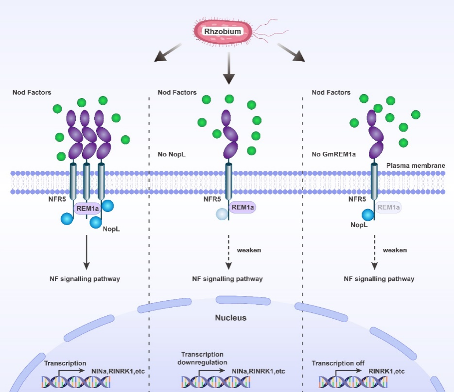NopL与GmREM1a和NFR5调控根瘤共生的模型
