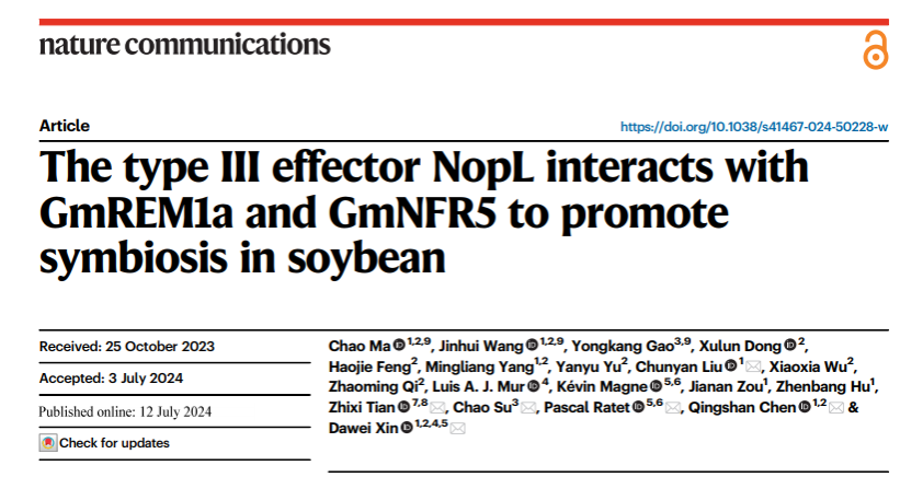 7月12日,东北农业大学农学院、智慧农场技术与系统全国重点实验室和大豆生物学教育部重点实验室辛大伟教授、陈庆山教授等与多家单位合作,在解析根瘤菌III型效应因子调控共生结瘤机制方面取得新进展,成果以《The type Ⅲ effector NopL interacts with GmREM1a and GmNFR5 to promote symbiosis in soybean》为题发表于国际著名期刊《自然•通讯》 (Nature Communications)。该研究揭示了广宿主根瘤菌Sinorhizobium fredii HH103的III型效应因子NopL通过与GmREM1a和NF受体NFR5互作影响NF信号传递,并促进GmNFR5在nanodomain上的招募,进而影响大豆与根瘤菌共生建立。