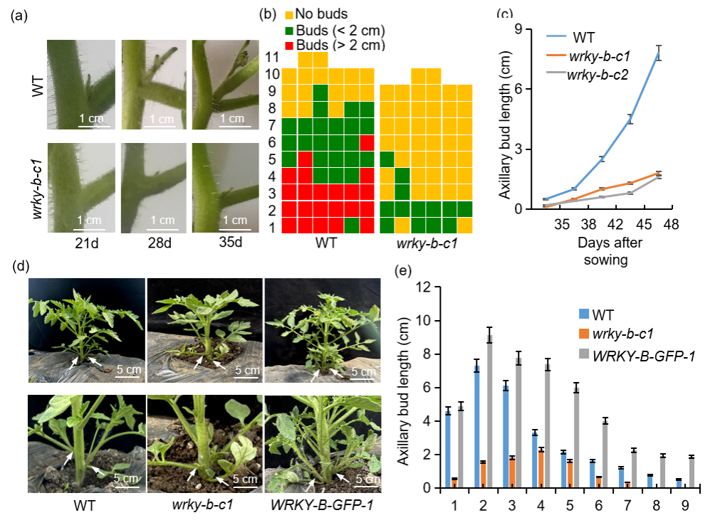 侧枝是影响番茄产量的重要农艺性状,过多或过长的侧枝会直接影响番茄营养生长和生殖生长的平衡关系,最终对番茄产量产生不利影响。此外,频繁的整枝打杈是番茄栽培生产中极为耗时耗力的一项工作。阐明番茄侧枝发育的内在机理不仅有助于丰富植物侧枝发育的调控机制,还有利于推动生物技术手段培育少侧枝的番茄品种,这将极大地节省番茄生产中的人力与时间成本。近日,东北农业大学园艺园林学院番茄课题组杨欢欢副教授系统解析了转录因子WRKY-B调控番茄侧枝发育的作用机理