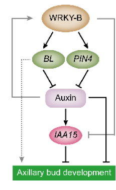 Aux/IAA是生长素信号途径的抑制因子。此前有报道,番茄IAA15也参与侧枝的发育,然而与wrky-b突变体的表型相反,IAA15敲除植株的侧枝数量和长度都有所增加。该研究发现WRKY-B可以靶向IAA15并负调控IAA15的表达。因此,推测WRKY-B可能通过至少三种不同的机制促进番茄侧枝的形成:第一,通过结合和激活关键侧枝基因BL;第二,通过激活PIN4促进叶腋处生长素的外排;第三,通过抑制IAA15来阻止生长素对侧芽生长的抑制作用(图3)。