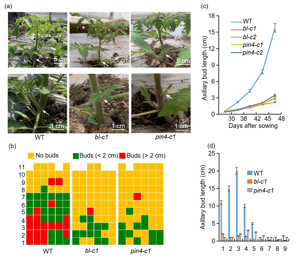 首先,通过外源激素处理和内源激素含量测定,表明番茄WRKY-B (WRKY-BRANCHED)转录因子受到生长素诱导表达。与野生型相比,过表达WRKY-B基因后的番茄材料表现出了侧枝增多的表型,而突变体wrky-b表现出侧枝减少的表型(图1),明确了WRKY-B正向调控番茄侧枝发育。通过RNA-seq及Chip-seq分析,发现WRKY-B可能通过正向调控侧枝发育明星基因BL和生长素外运基因PIN4来调控侧枝的发育。基因表达分析、体外EMSA和酵母单杂交实验显示WRKY-B直接结合并调控BL和PIN4的表达。此外,在野生型材料中分别敲除BL和PIN4基因后,植株的侧枝形成均受到抑制(图2)。内源激素含量测定显示相比野生型,wrky-b、bl和pin4突变体叶腋处生长素含量明显增加,说明可能通过调控生长素的稳态影响侧枝发育。