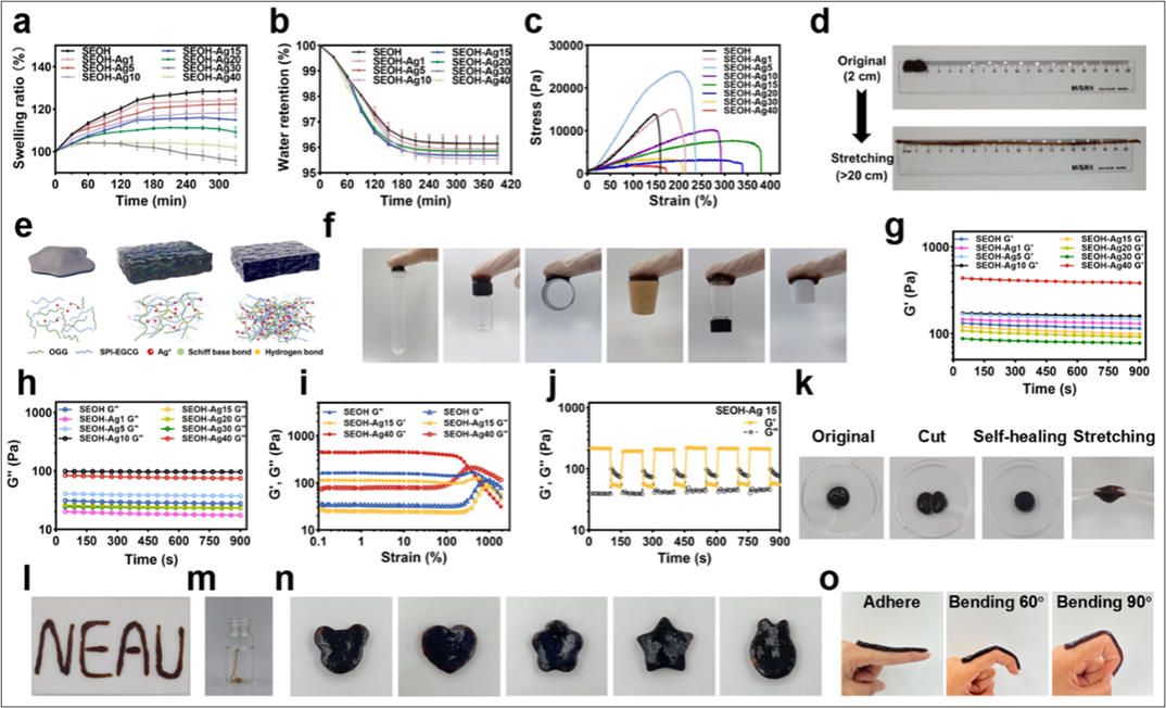 通过梯度调控金属-配体键的密度,实现了对水凝胶机械性能(如拉伸性能高达380%)、溶胀行为和流变学特性的可控调节,以满足大豆蛋白在多种应用中的多样化需求。研究发现,Ag+浓度为5 mg/mL时,水凝胶内部呈现出牺牲键和刚性化学键之间的平衡状态。而当Ag+浓度为10至15 mg/mL时,牺牲键为主导作用。当施加高应变时,刚性的可逆共价键会断裂,从而降低拉伸应力。当Ag+浓度进一步增加到30至40 mg/mL时,蛋白质开始聚集,导致凝胶网络结构容易断裂,这使得水凝胶失去了其延展性和承载能力。此外,该水凝胶还展现出卓越的自愈合能力、良好的粘附性和可注射性,具备显著的抗菌性能、抗炎效果、调控巨噬细胞极化的潜能和优异的生物相容性,能有效促进细胞迁移、血管新生和胶原沉积,显著加速伤口愈合过程,展示了其作为先进生物材料的巨大应用前景。