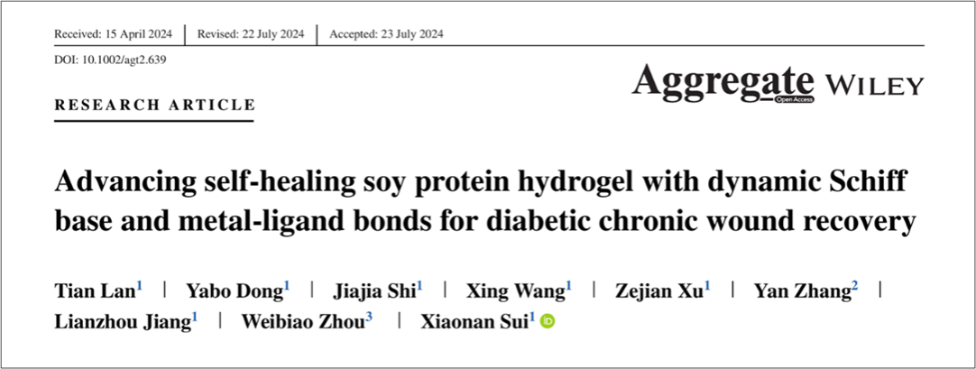 近日,东北农业大学食品学院江连洲教授团队隋晓楠教授课题组在期刊Aggregate(中科院一区,IF=13.9)在线发表了题为“Advancing Self-Healing Soy Protein Hydrogel with Dynamic Schiff Base and Metal-Ligand Bonds for Diabetic Chronic Wound Recovery”的研究论文。本研究成功开发了一种基于动态化学键交联的新型大豆蛋白基水凝胶,在推动植物蛋白高值化应用领域展现出巨大的潜力和广阔的发展前景。东北农业大学为本文的第一署名单位,这是学校首次在该期刊上发表论文,东北农业大学隋晓楠教授为通讯作者,兰天副教授为第一作者。