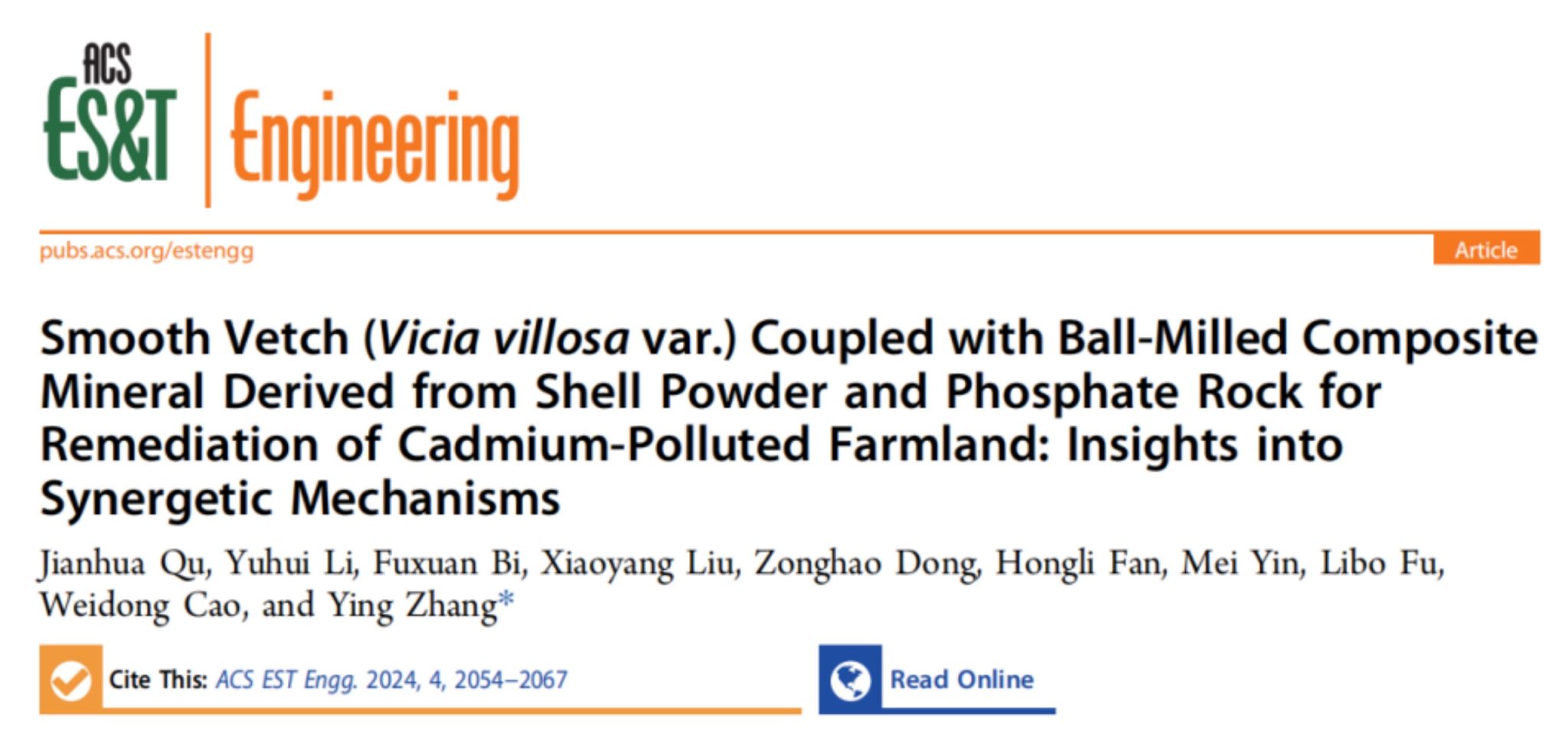 近日,东北农业大学资源与环境学院张颖团队曲建华教授在国际著名学术期刊《ACS ES&T Engineering》发表了题为《Smooth Vetch (Vicia villosa var.) Coupled with Ball-Milled Composite Mineral Derived from Shell Powder and Phosphate Rock for Remediation of Cadmium-Polluted Farmland: Insights into Synergetic Mechanisms》的研究论文(https://doi.org/10.1021/acsestengg.4c00177)。该研究受“十四五”国家重点研发计划项目-新型绿肥产品创制与产业化的资助。