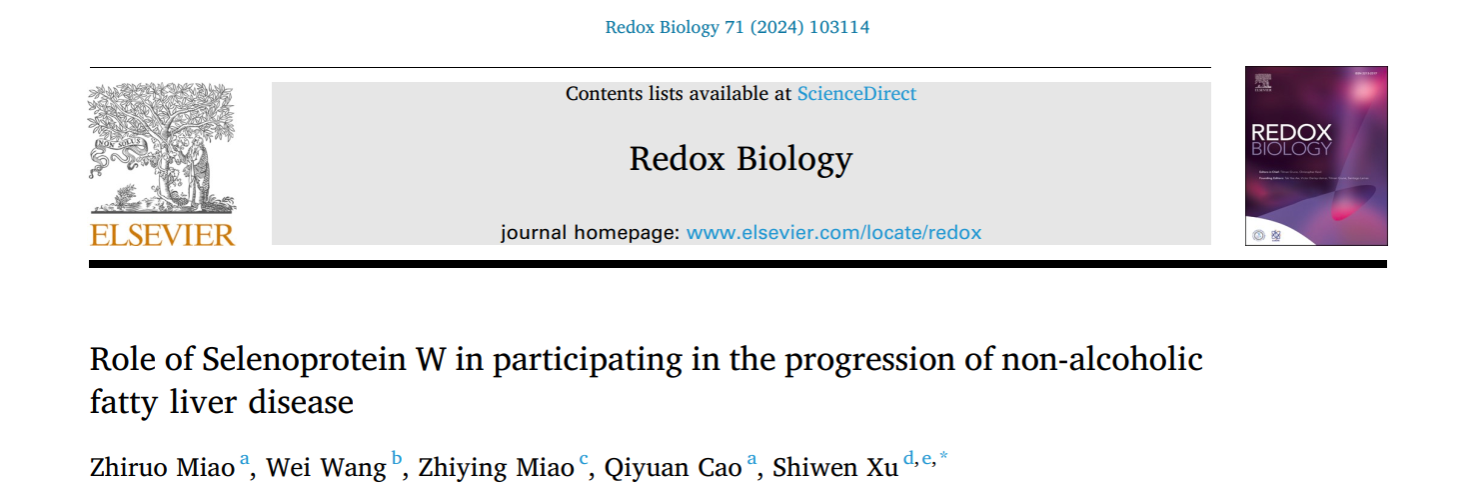 非酒精性脂肪肝(NAFLD)是一种与肥胖、糖尿病和代谢综合症相关的肝脏疾病,其特征是在没有大量饮酒的情况下肝脏脂质异常积累。团队发现硒蛋白W通过调节代谢重编程激活巨噬细胞的 cGAS/STING 信号传导来促进肝细胞凋亡和焦亡,从而加剧NAFLD的进展。相关成果于2024年3月5日发表于《Redox Biology》。苗芷若博士为论文第一作者,徐世文教授为通讯作者。该项研究工作得到国家自然科学基金区域创新发展联合基金(No.U22A20524)和黑龙江省自然科学基金(No.ZD2023C002)项目的资助。