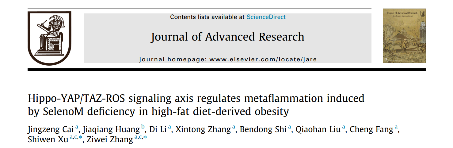 高脂饮食衍生性肥胖指的是由于长期摄入高脂肪饮食而导致的肥胖。肥胖是一种代谢性疾病,同时也是一种慢性炎症状态,其中脂肪组织是炎症反应的始动环节。团队发现硒蛋白M主要通过Hippo-YAP/TAZ-ROS信号轴来改善肥胖时的代谢性炎症。硒蛋白作为一种潜在的治疗手段,有望为肥胖管理和相关代谢疾病的治疗开辟新的途径。相关成果于2024年6月13日发表于《Journal of Advanced Research》。蔡敬增讲师为论文第一作者,张子威教授和徐世文教授为共同通讯作者。该项研究工作得到国家自然科学基金(No.31872531)和黑龙江省自然优秀青年项目(No.YQ2021C021 )的资助。