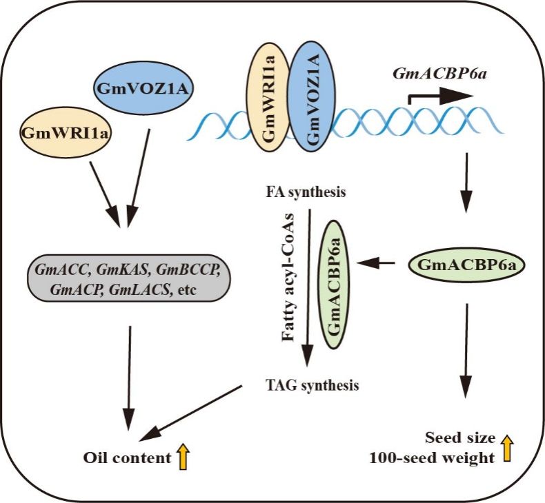大豆是重要的油料作物,研究大豆油脂合成的转录调控能为提高大豆油脂含量提供科学依据。GmWRI1a是调控大豆油脂合成通路中的主要转录激活因子之一,该团队前期研究发现,GmWRI1a基因通过调控油脂合成相关基因的上调表达促进大豆油脂产量。该研究利用酵母双杂交文库筛选方法,在大豆种子酵母cDNA文库中筛选到一个新的候选互作蛋白维管一锌指蛋白(GmVOZ1A)。在大豆中过表达GmVOZ1A基因,提高了GmVOZ1A-OE转基因大豆种子油分和总脂肪酸的含量。GmVOZ1A-OE大豆种子转录组分析表明,GmVOZ1A通过调节参与脂肪酸生物合成相关基因的表达来增强种子脂肪酸和油脂合成。相反,GmVOZ1A基因功能丧失导致大豆毛状根中三酰甘油(TAG)含量显著降低。利用体内外蛋白-DNA相互作用试验和遗传学试验证实了转录因子GmWRI1a和GmVOZ1A共同上调脂肪酸合成途径中编码酰基辅酶A结合蛋白(acyl-CoA-binding protein, ACBP)的GmACBP6a基因的表达,并协同促进大豆中TAG的积累。GmACBP6a过表达提高了大豆种子脂肪酸和油脂含量,增加了种子大小和百粒重。