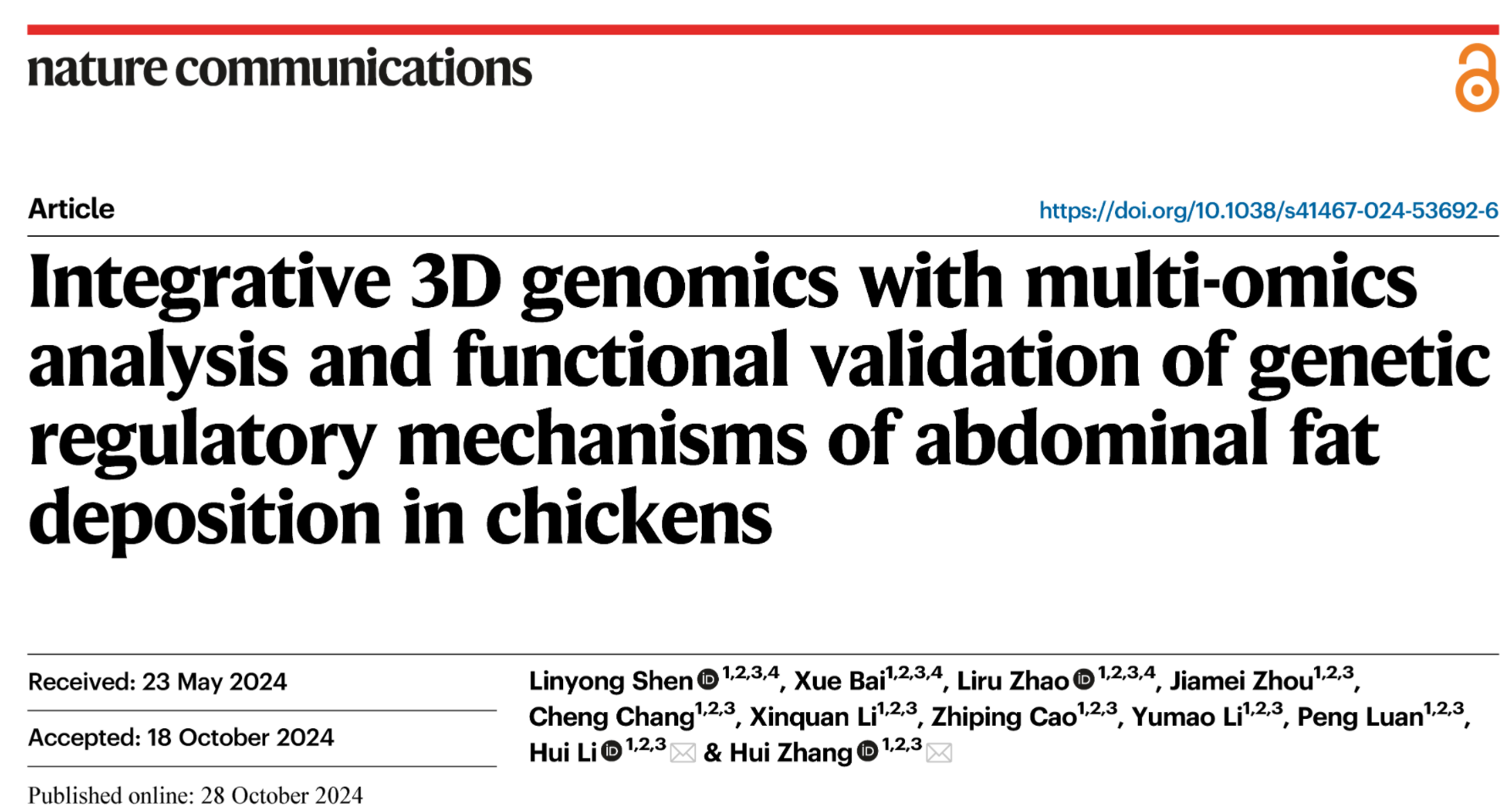 近日,东北农业大学动物科学技术学院“农业农村部鸡遗传育种重点实验室(东北农业大学)”在国际学术期刊Nature Communications(中科院1区期刊,影响因子14.7)上发表了题为“Integrative 3D genomics with multi-omics analysis and functional validation of genetic regulatory mechanisms of abdominal fat deposition in chickens”的研究性论文,该研究从三维基因组角度揭示了肉鸡腹部脂肪沉积的遗传调控机制。