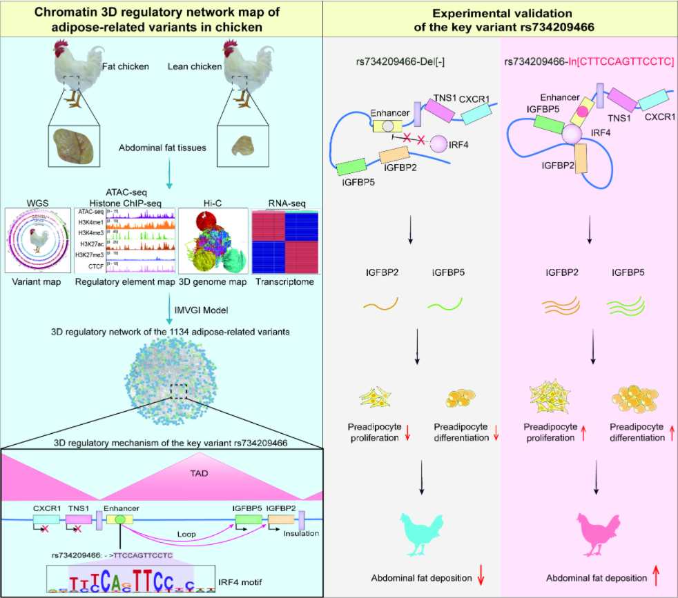 农业农村部鸡遗传育种重点实验室(东北农业大学)聚焦“基因组变异影响染色质空间构象,进而调控基因转录”这一核心科学问题,将染色质空间构象作为连接基因组变异与转录调控的纽带,从三维基因组角度鉴定影响肉鸡腹脂沉积的关键基因组变异并解析其具体调控机制。该项研究通过整合表型、基因组、表观组、三维基因组、转录组等多组学数据,全面绘制了与肉鸡脂肪性状相关的功能变异、顺式调控元件、转录因子、三维基因组结构及目标基因的三维调控网络,从而解析了基因组变异调控基因转录最终影响肉鸡腹脂沉积的具体机制。此外,该研究以rs734209466变异位点为例,阐述了基因组变异如何通过改变染色质的三维构象,影响目标基因的转录,最终影响肉鸡腹脂沉积。