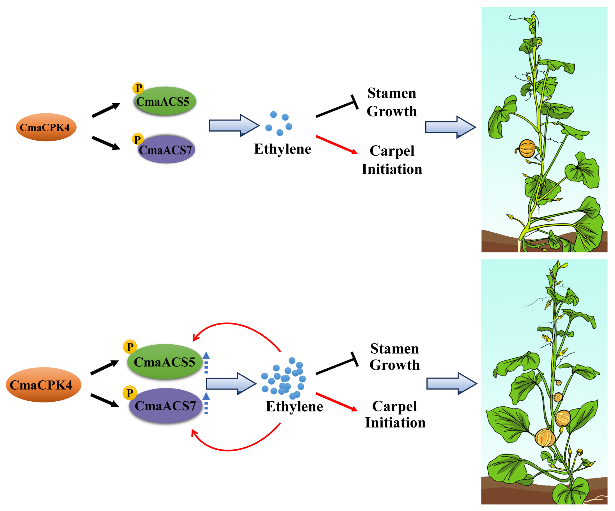 综上所述,该研究解析了CPK4-ACS5/ACS7模块在调控南瓜性别决定中的作用机制,为精准高效培育高产南瓜品种提供理论与技术支撑,也丰富了葫芦科作物性别决定的调控网络。