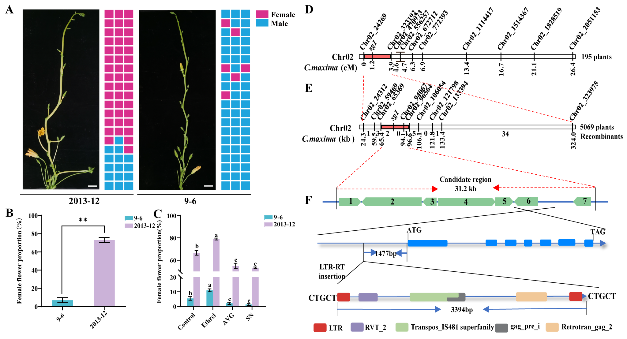 南瓜为葫芦科一年蔓生性草本植物,是世界范围内重要的园艺作物。南瓜属作物主要的性别形式是雌雄异花同株,其产量与雌花出现早晚及数量密切相关。强雌性的利用可以显著增加南瓜的产量,提高制种效率及杂交种的纯度,强雌品系的培育已经成为南瓜育种的主要目标。但目前南瓜强雌控制基因未见报道,其调控机制尚不明确。