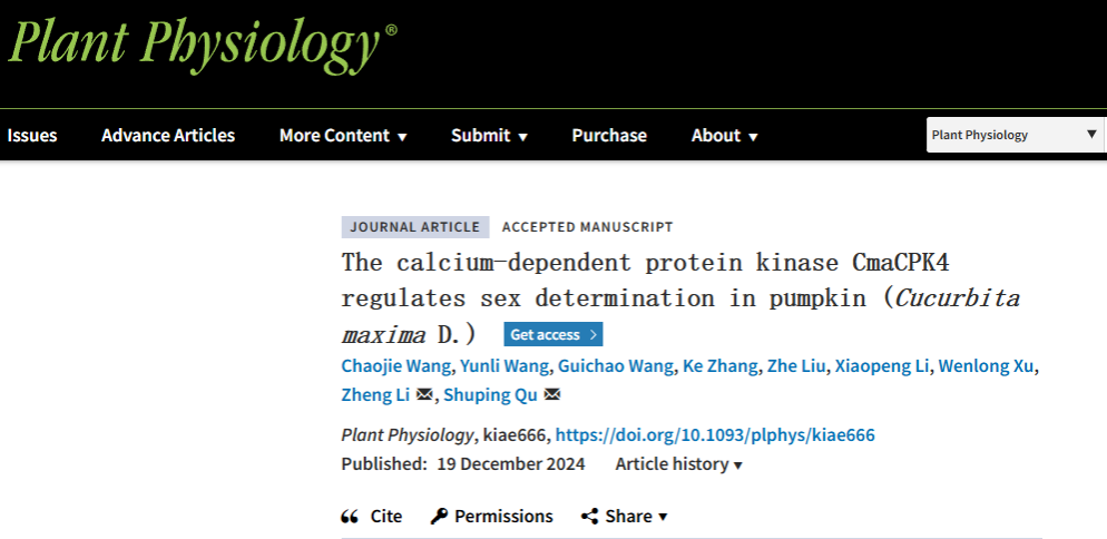 近日,东北农业大学园艺园林学院瓜类分子育种团队屈淑平教授在国际知名期刊《Plant Physiology》(植物生理)(五年IF=7.6,中科院1区Top期刊)在线发表了“The calcium-dependent protein kinase CmaCPK4 regulates sex determination in pumpkin (Cucurbita maxima D.)”的研究论文,该研究基于正向遗传学手段成功精细定位并克隆控制印度南瓜强雌性状的重要功能基因CmaCPK4,并解析其分子机制,该研究工作为南瓜性别决定调节机制提供了重要的基因资源。