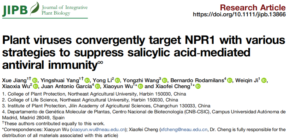2月21日,我校植物保护学院程晓非教授在国际知名期刊《Journal of Integrative Plant Biology》(IF=9.3,中科院1区Top期刊)在线发表了题为“Plant viruses convergently target NPR1 with various strategies to suppress salicylic acid-mediated antiviral immunity”的研究论文,揭示了不同类型植物病毒编码蛋白靶向并抑制水杨酸受体NPR1功能的分子机制。
